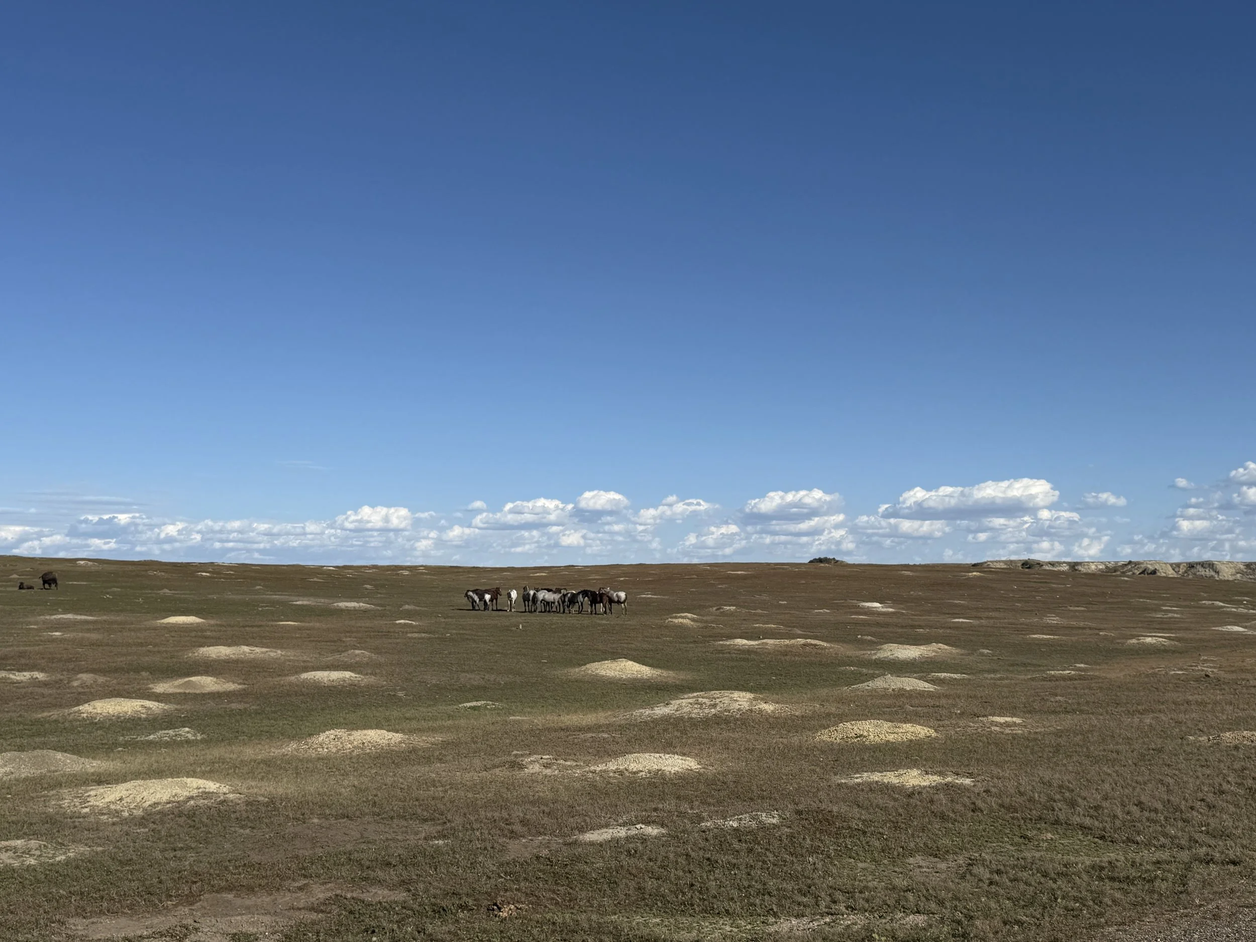 The winding road leads us through stunning, rugged terrain — spectacular vistas around every curve. Eventually, we make our way to the South Unit, where we’re greeted by prairie dogs, bison, and even wild horses. These horses, believed to be descendants of Sitting Bull’s herd and related to the Nokota breed, roam freely across the rough, open landscape.