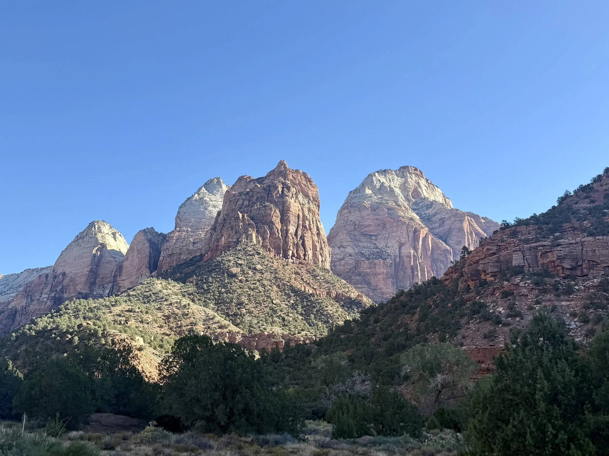 After a leisurely morning, we hop on the shuttle to tour Zion Canyon. No private cars are allowed in the park, which makes the experience feel even more serene. Located in southwestern Utah, Zion National Park is renowned for its massive sandstone cliffs, narrow canyons, and the Virgin River, offering a diverse range of activities that include hiking, rock climbing, camping, and quiet reflection. Sitting at the crossroads of the Mojave Desert, Colorado Plateau, and Great Basin ecosystems, the park boasts dramatic scenery and remarkable biodiversity.